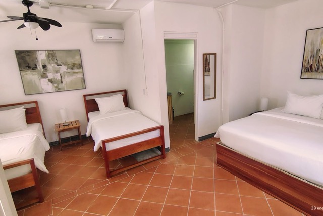 Our Family Twin room is the perfect space for those traveling in a group or with family. It features a comfortable double bed and twin beds, ensuring comfort and rest for everyone. It includes a private bathroom with complimentary toiletries, free Wi-Fi, and large windows that allow natural light to fill the room, creating a warm and cozy atmosphere. Ideal for those seeking a pleasant and relaxing stay surrounded by nature.